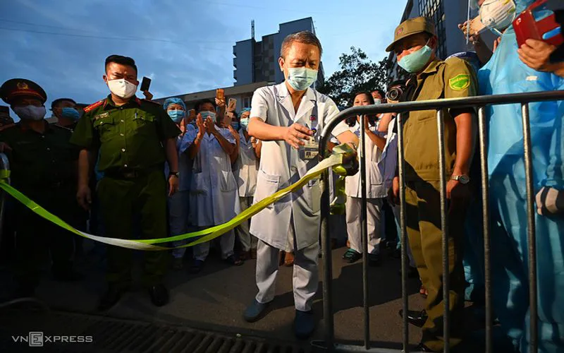 Le Ngoc Thanh (in white shirt), director of the Hospital E, removes the fences Photo: Giang Huy/VNE |