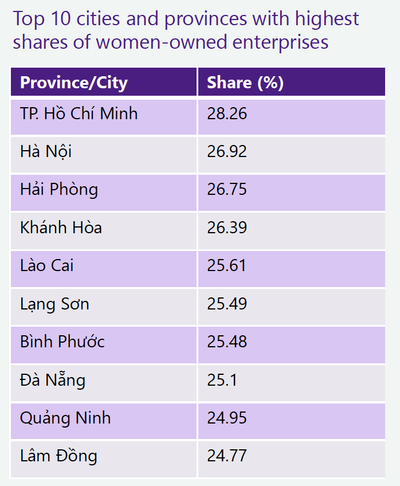 Ho Chi Minh City and Hanoi, Vietnam’s two major economic hubs, take the two top spots nationwide in terms of percentage of women-led enterprises at 28.26% and 26.92%, respectively, according to Vu Tien Loc, chairman of the Vietnam Chamber of Commerce and Industry (VCCI).