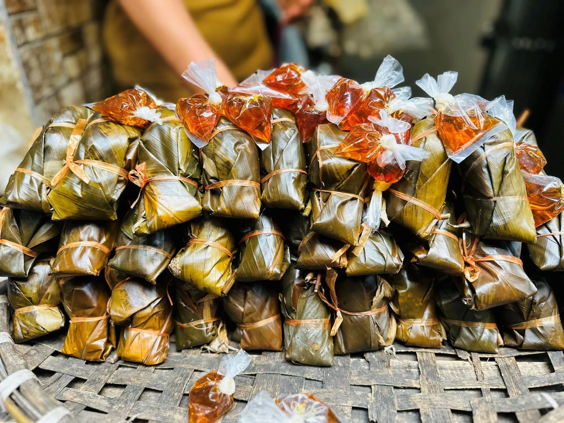 Banh tro, or banh gio, is made of sticky rice and soaked in ash water (the ash comes from burning a number of leaves such as dried sesame or rice straw and is put in water). It's served with sugarcane syrup. Photo: Hoang Quyen