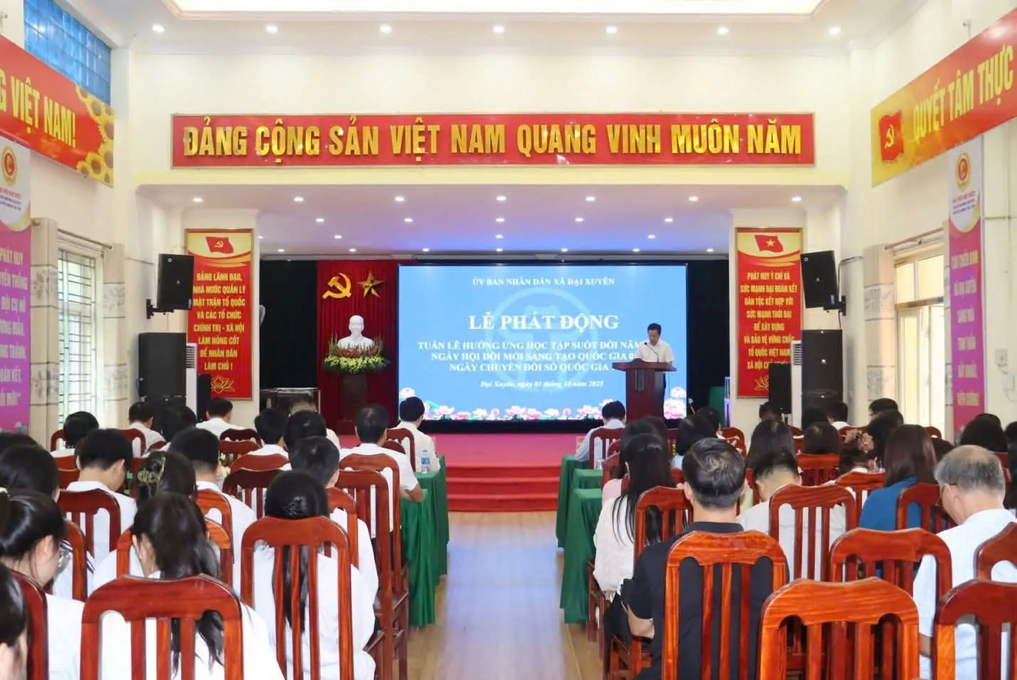 Hoang Tuan, Chairman of the People's Committee of Dai Xuyen Commune in Hanoi, makes speech to launch the Lifelong Learning Week 2025. Photo courtesy of the commune