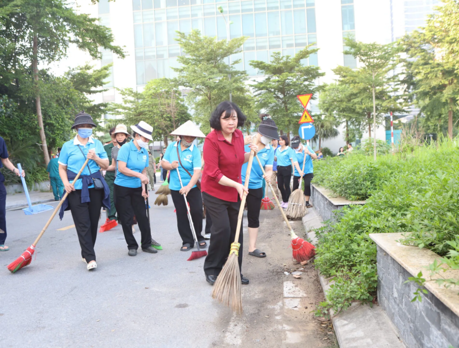 Early this morning, Secretary of the Hanoi Party Committee Bui Thi Minh Hoai worked alongside residents of Xuan Dinh Ward in the campaign.