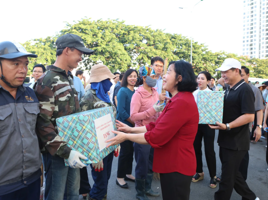 Hanoi Party Secretary Bui Thi Minh Hoai presents gifts to sanitation workers.