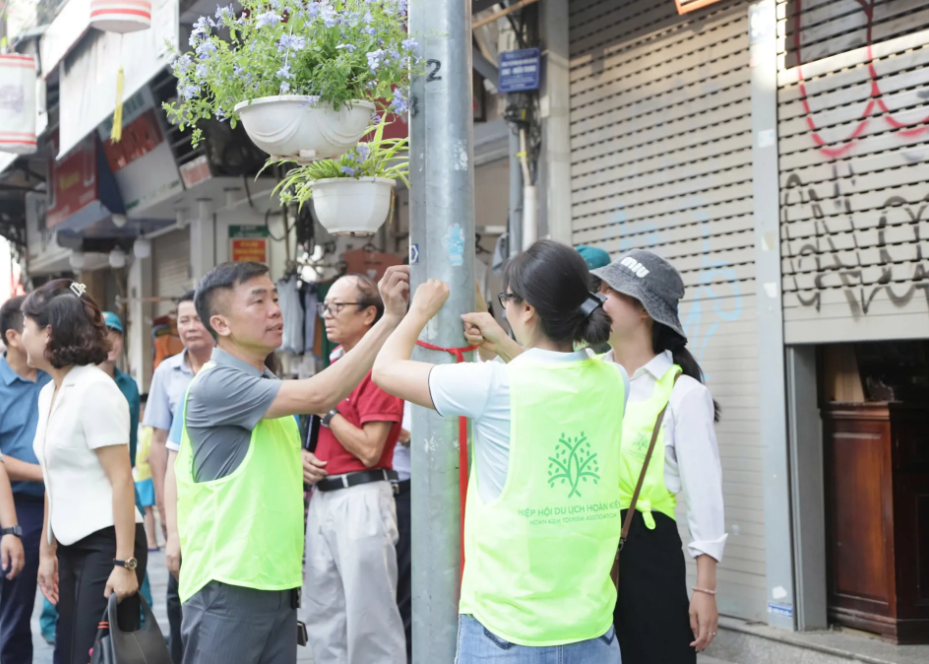 Hoan Kiem Tourism Association joins environmental cleanup and removes illegal advertisements along city streets.
