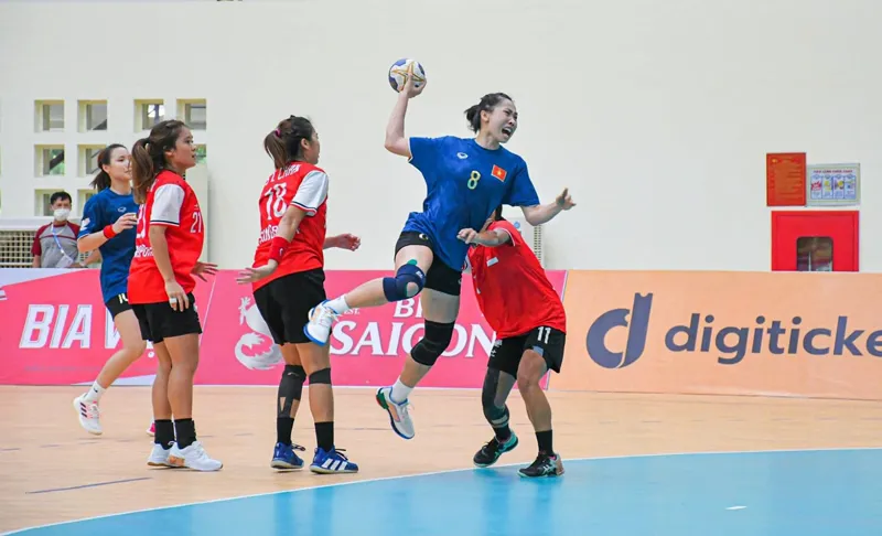 | Hanoi athletes (blue) won the gold medal in indoor handball at the 9th National Sports Games. Photo: VNA |