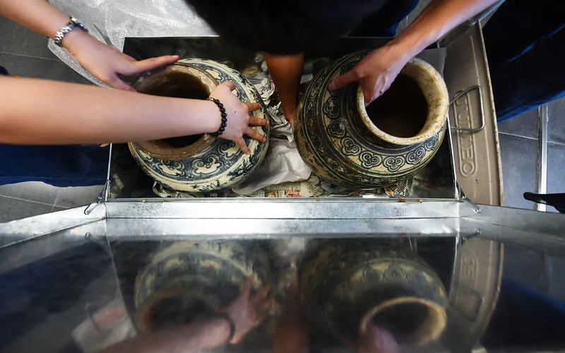 | The artifacts are wrapped in newspapers and put in boxes to avoid collisions during transportation. Nguyen Kim Ngan said that the artifacts are best preserved in 25 degrees Celsius, with a humidity of 55%. |