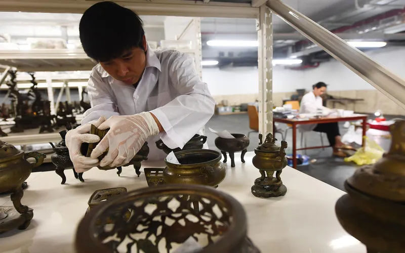 | Nguyen Xuan Quang, a museum staffer, is assessing the status of copper incense burners for optimal preservation. |