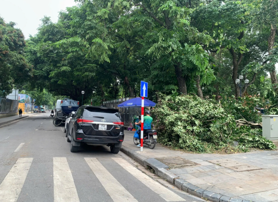 Fallen trees are being removed from Le Thach Street on the morning of July 20. Photos: Hong Thai/The Hanoi Times