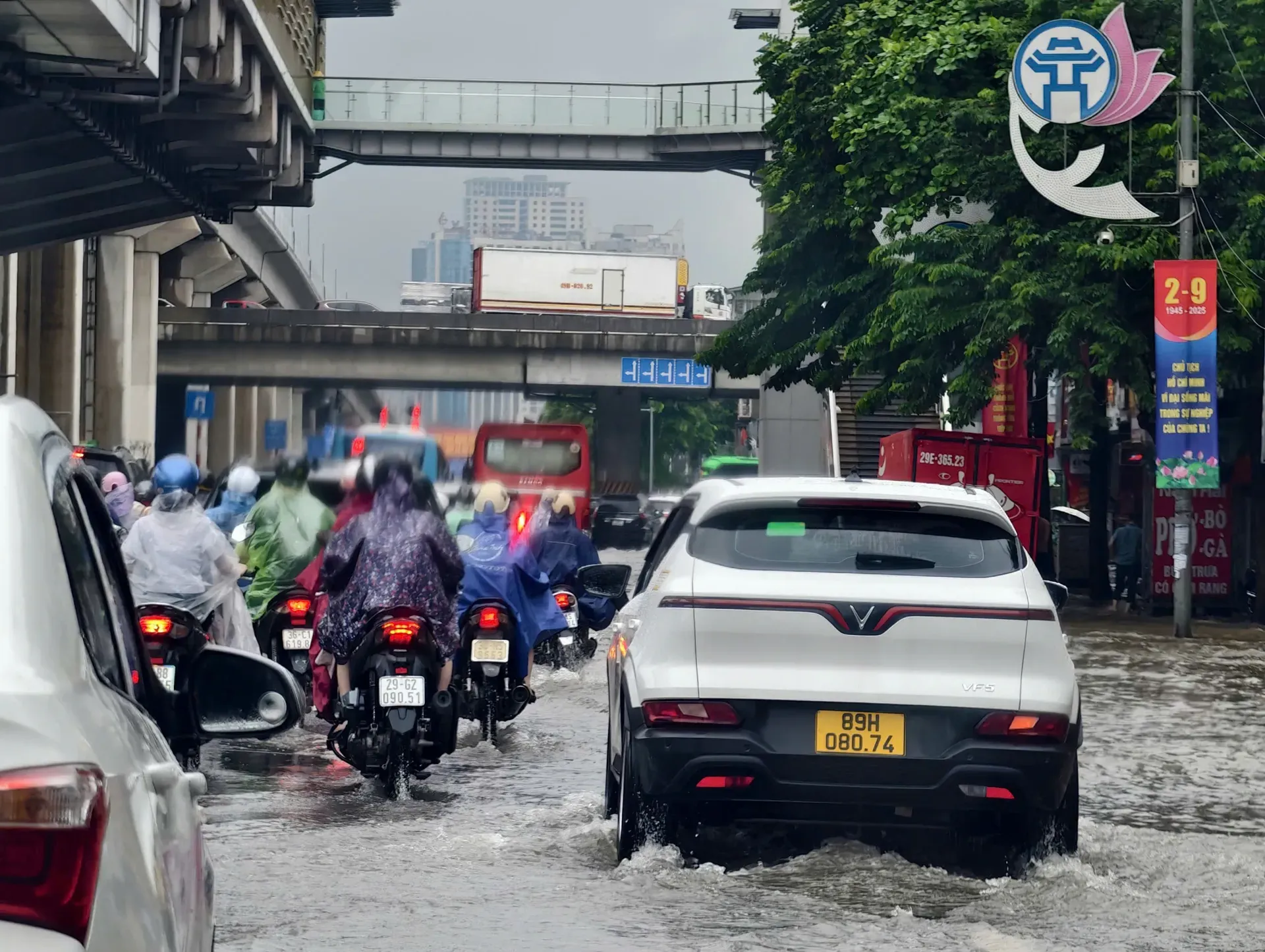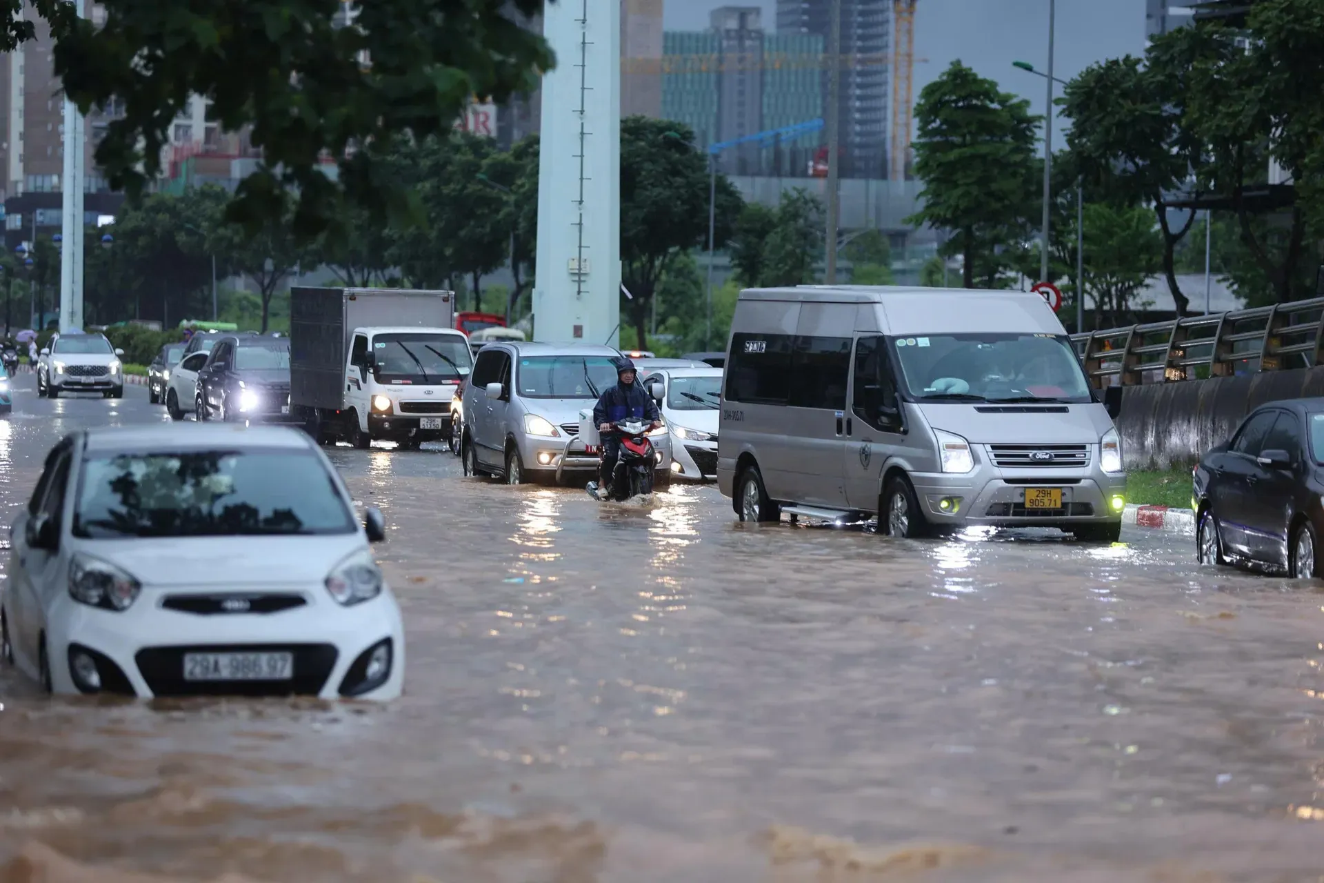 On Nguyen Trai Road, near the underpass, vehicles struggle as half the road was under deep water.