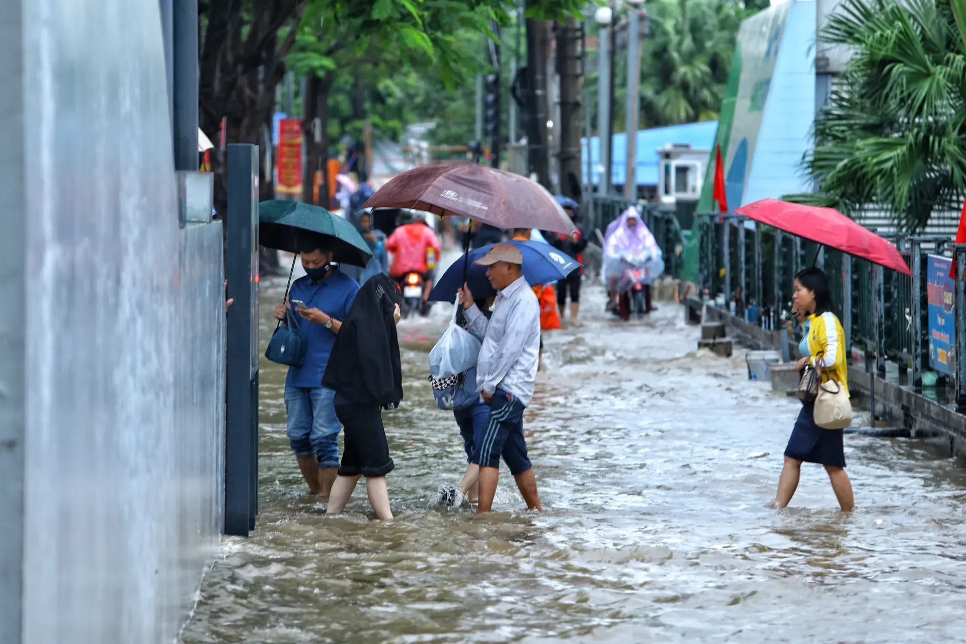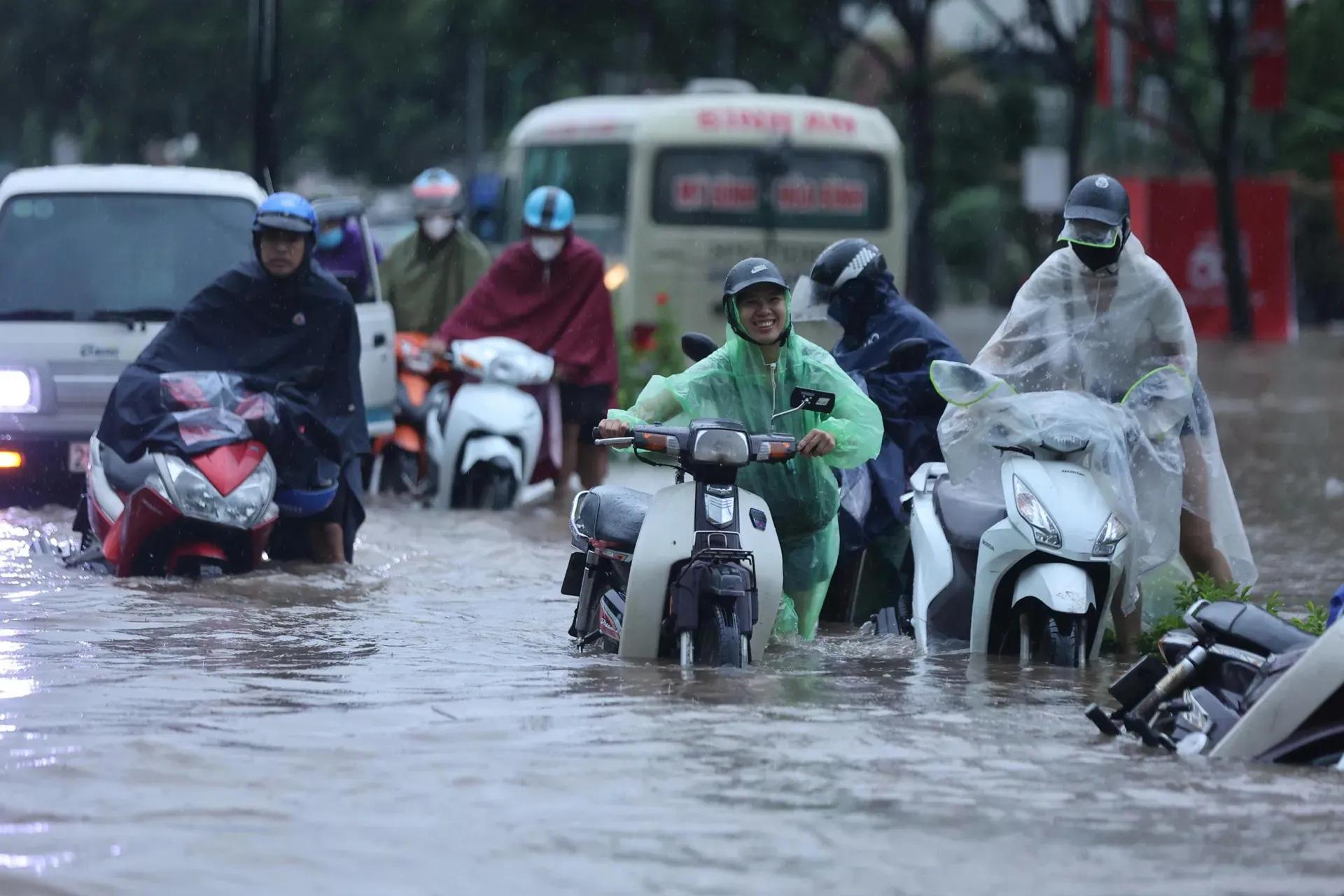 Some people walked barefoot while others struggled to push their motorbikes through flooded streets, as heavy rain submerged parts of Hanoi on the morning of August 26.