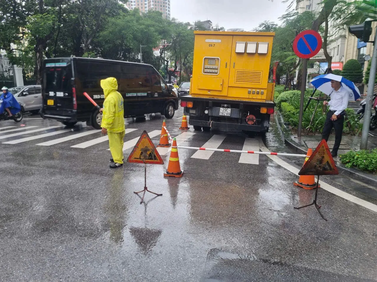 On Lang Ha Street, traffic police are on site early to guide vehicles through flooded sections and support residents.