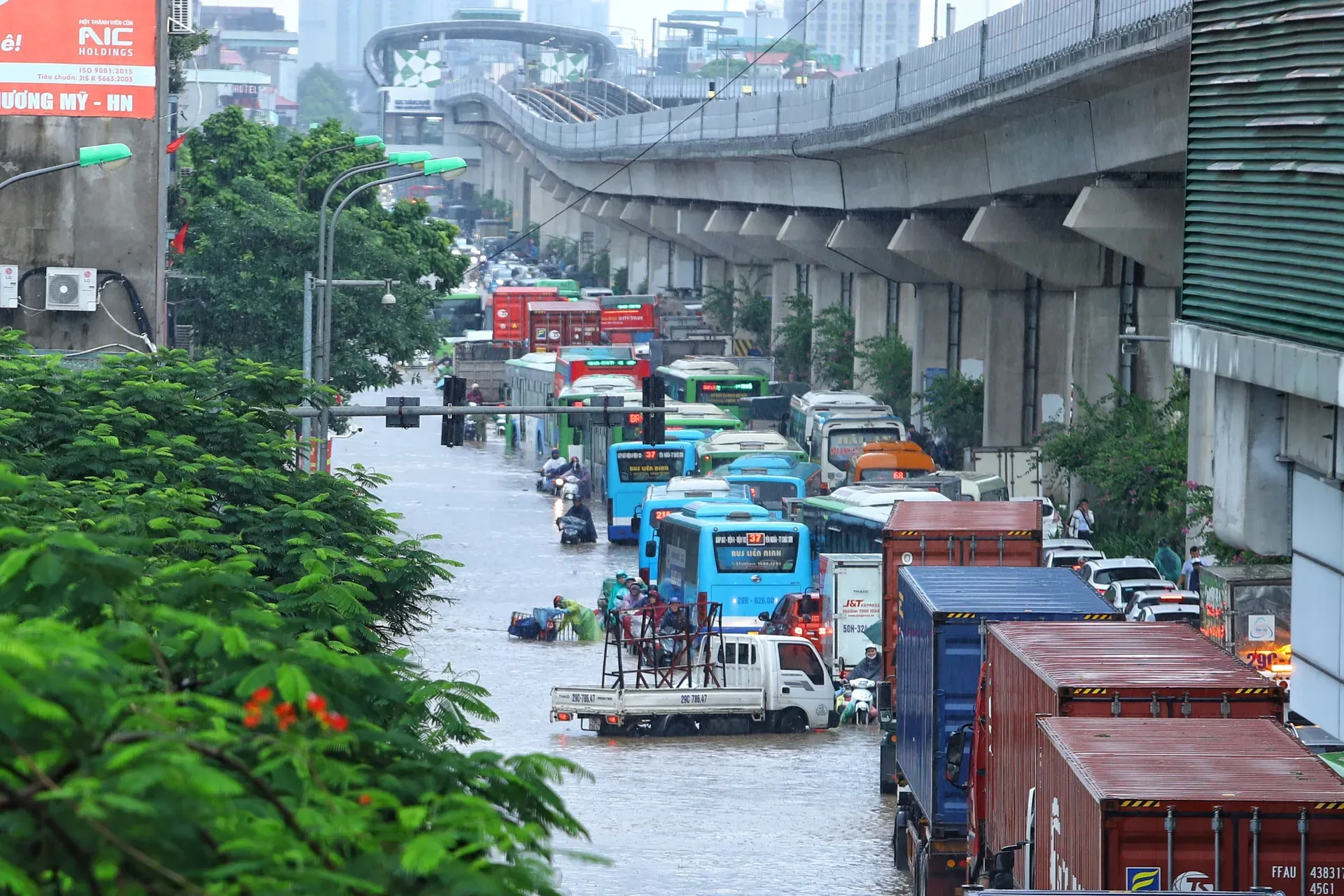 Hanoi people struggle as heavy rain floods urban roads