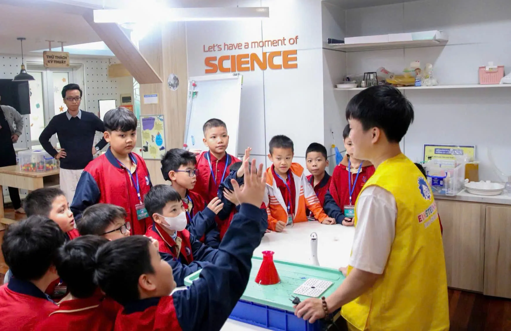 Tran Phuc Dai An (in yellow), an eighth grader at Hanoi-based Lomonosov Education System, is guiding his schoolmates to enjoy an exciting hands-on trip to Einstein House themed “Exploring Light”. Photos: Anh Kiet/The Hanoi Times