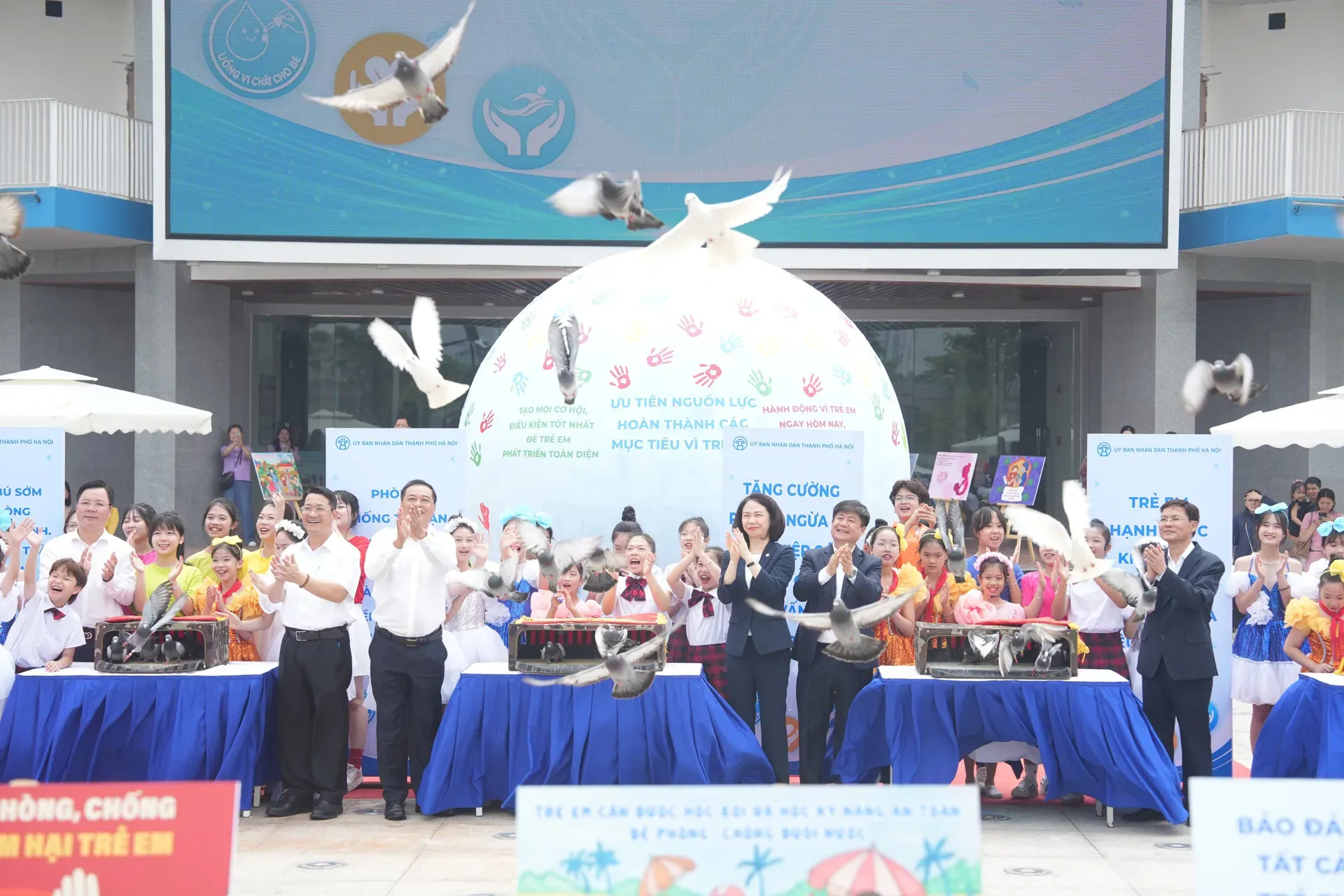 Vu Thu Ha (center in suit), Vice Chairwoman of the Hanoi People's Committee, and delegates participate in the pigeon release activity in 2025 titled "Joining hands to act for children". Photo: The municipal Department of Health