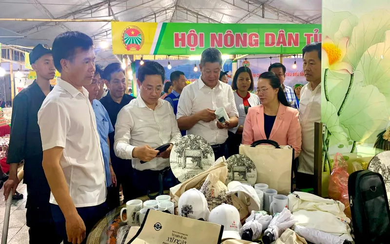 Deputy Chairman of the Hanoi People's Committee Nguyen Manh Quyen (white shirt, middle) and leaders of some provinces and cities inspect the OCOP products on display at the event. Photo: Anh Duong |