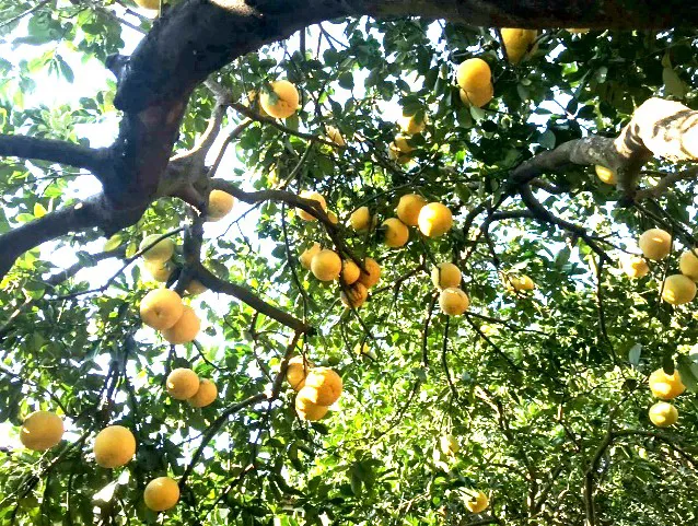 In the experience of pomelo growers, the older the tree, the sweeter the fruit. The skin of the fruit turns dark yellow when being ripe. Photo: Bich Hoi/The Hanoi Times |