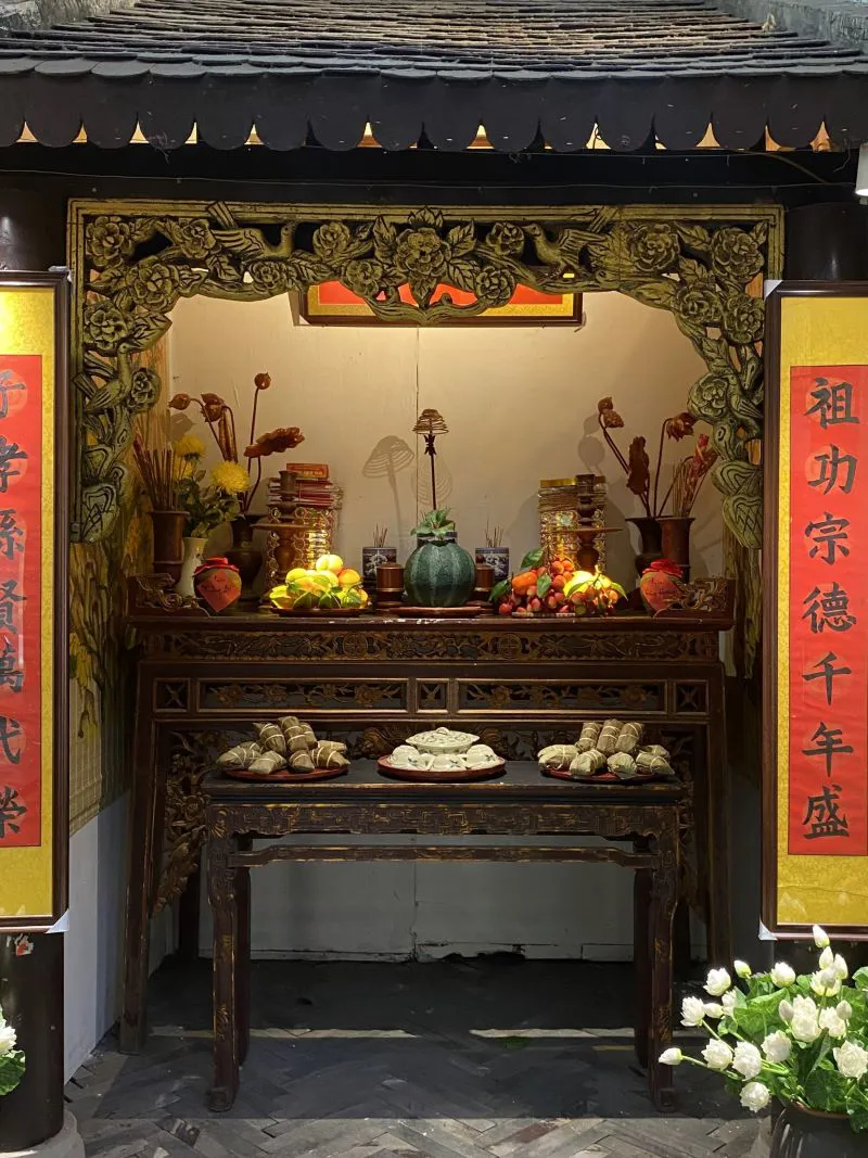 These customs have been faithfully recreated through a worship space and an exhibition area reminiscent of the two old streets of Thuoc Bac and Hang Mun in Thang Long.