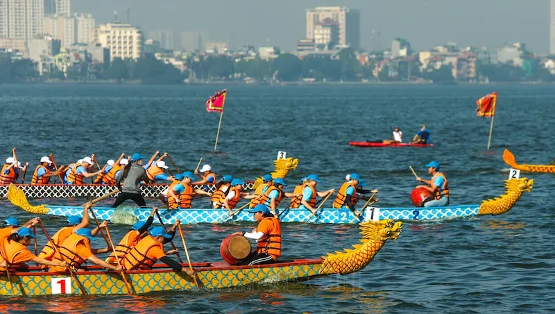 A colorful scene from the 2024 Dragon Boat Racing Competition on Hanoi's West Lake. Photo: Ngoc Tu/ The Hanoi Times