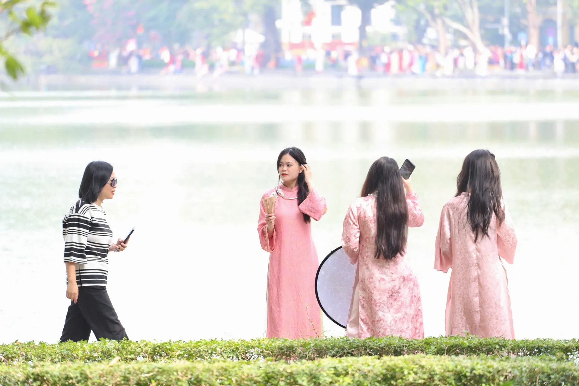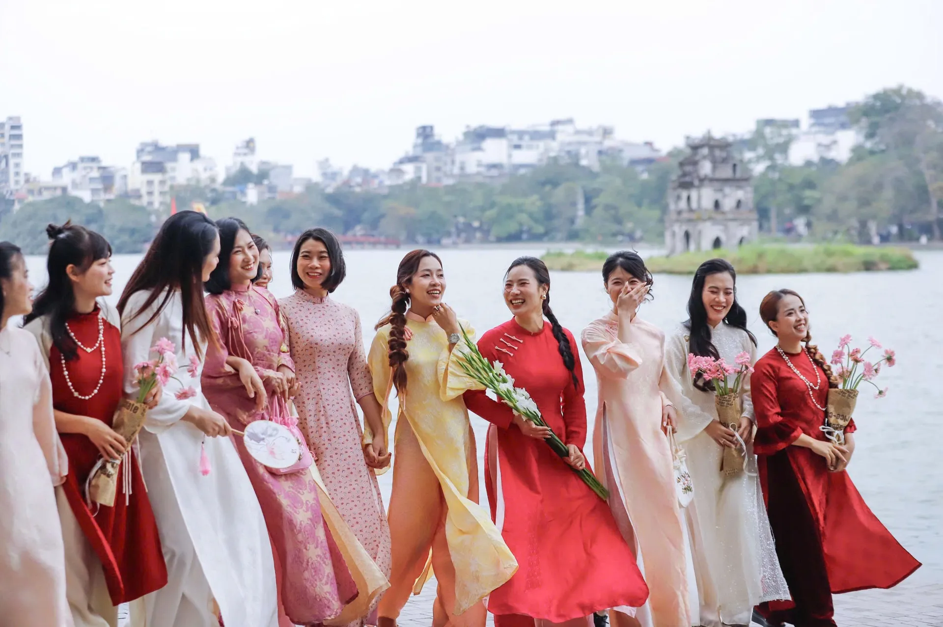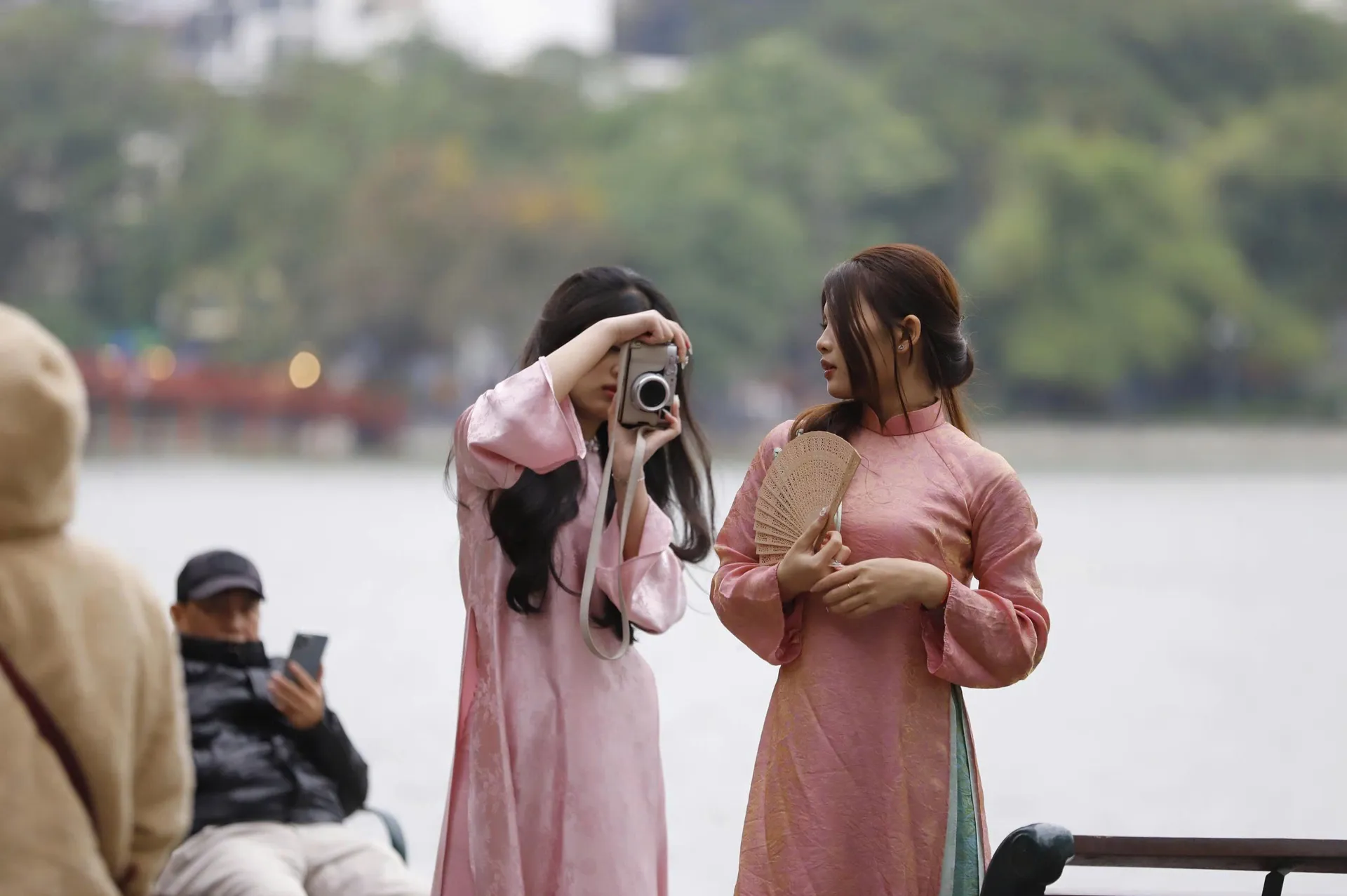 From early morning, many groups of friends gather at Hanoi’s Hoan Kiem Lake, carrying peach blossoms, apricot branches, conical hats and paper fans closely associated with the Lunar New Year. The scenes go beyond festive anticipation, reflecting a renewed engagement with heritage framed by the capital’s most familiar landmarks.