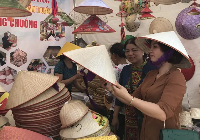 Visitors buy conical hats from Chuong village at the Tourism Fair of traditional craft villages in Thanh Oai District. Photo: Anh Ngoc/ The Hanoi Times |