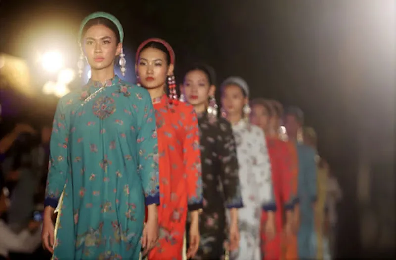 Ao dai show at the Temple of Literature. Photo: Lai Tan (Kinh te & Do thi) |