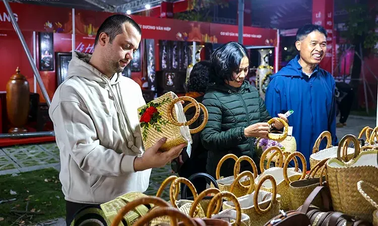 An international visitor (first left) is interested with handcrafted products displayed at the festival. Photo: VNA