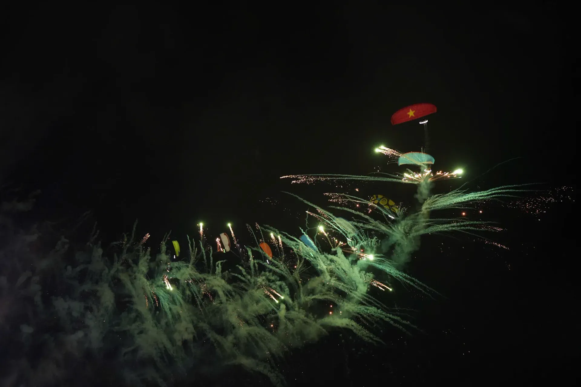 A paragliders carry the national flag across Hanoi’s night sky, symbolizing the aspiration for independence, freedom, and peace.
