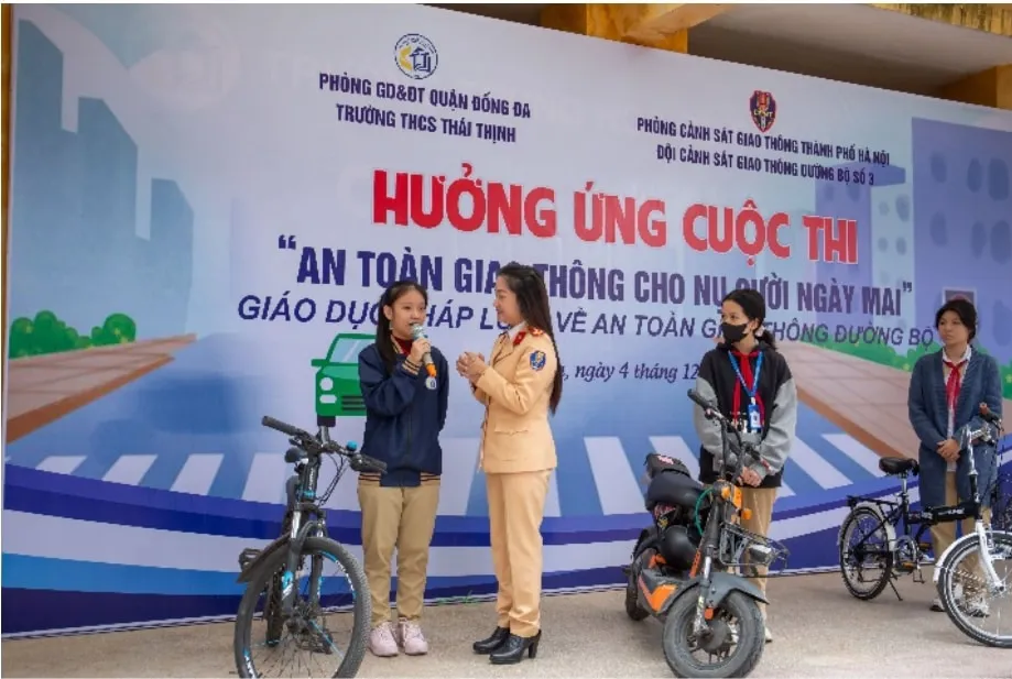 A traffic safety program organized in Thai Thinh Primary School with support from local police. Photo: congluan.vn
