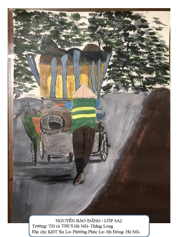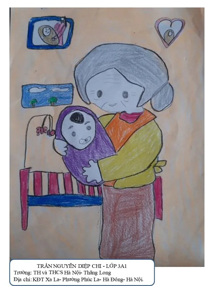 Two other prizes of the drawing competition went to Tran Nguyen Diep Chi, a 3rd grader, and Nguyen Dang Bao Dan and Tran Chi Linh, 5th graders. These paintings honor these pupils’ grandmothers, as shown through the images of them diligently caring for families (in Diep Chi’s painting), as well as other people (in Bao Dan’s work since her grandmother is a doctor at Bach Mai Hospital).