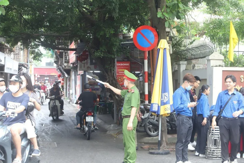 Hanoi police maintain security and order in front of Kim Lien High School (Dong Da District, Hanoi). Photo: Lai Tan |