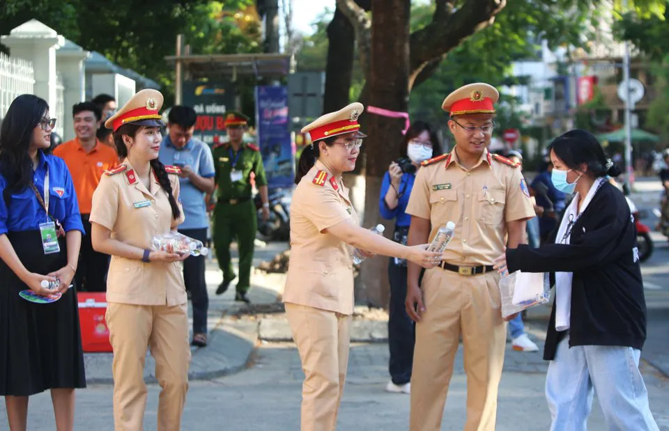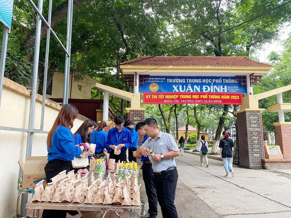 Youth volunteers hand out water to candidates in front of the Xuan Dinh High School in Bac Tu Liem District, Hanoi. Photo: Tran Thao |