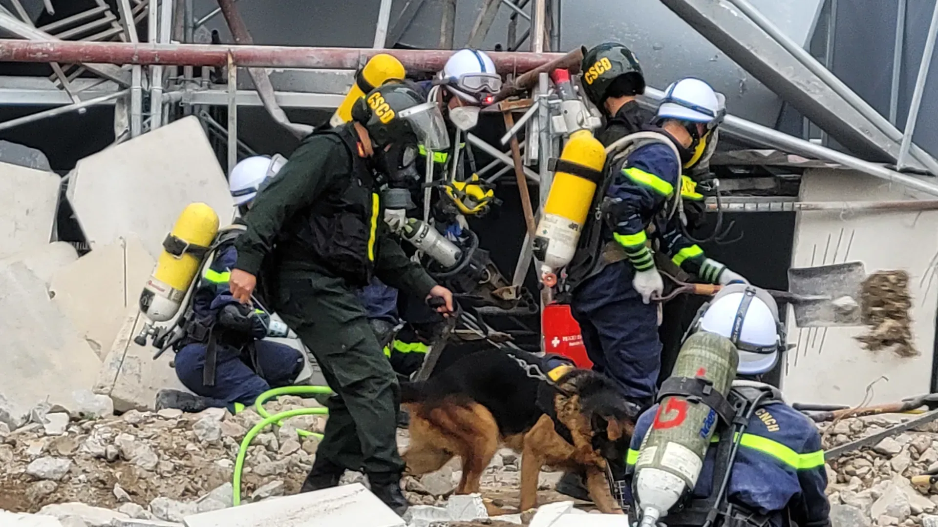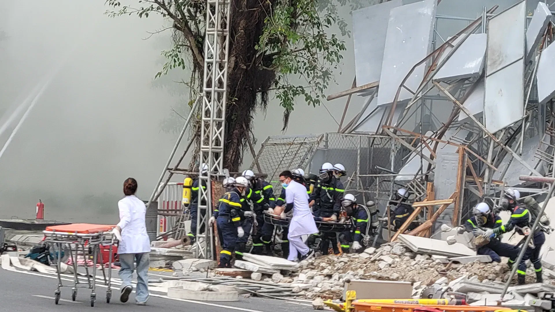 Firefighters and doctors approach the scene to extinguish the fire and rescue victims from the rubble.