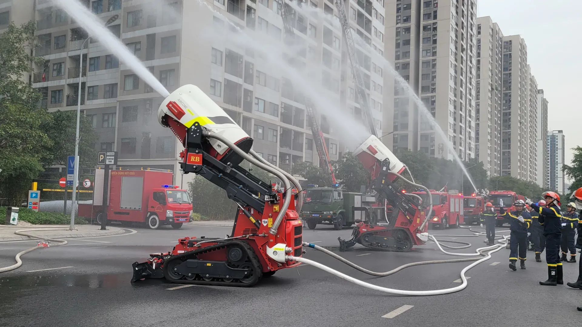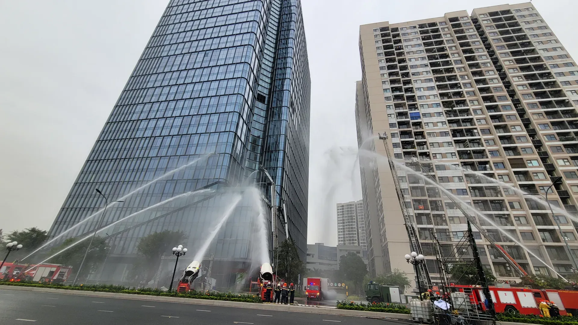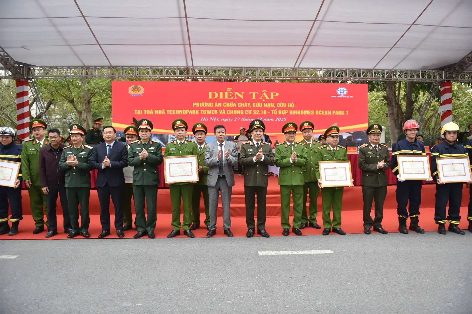 The exercise simulated a major fire and explosion at the Technopark Tower and an apartment building in the Vinhomes Ocean Park 1 urban area in Gia Lam Commune.
