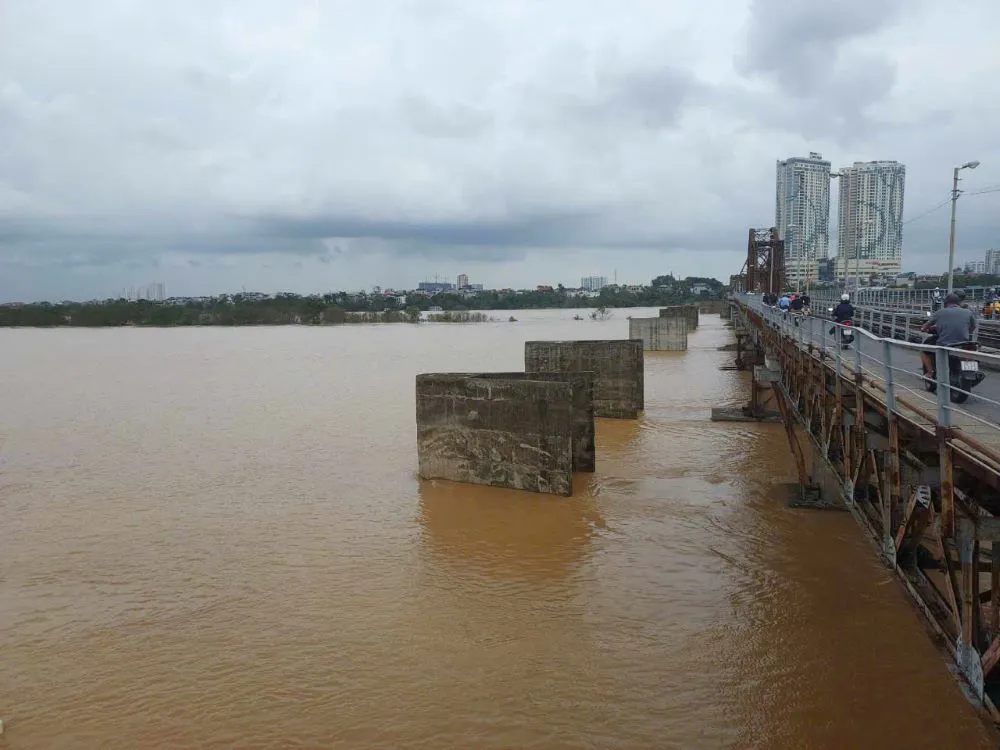 | Rising water level at Long Bien Bridge, Hanoi on the morning of September 10. Photo: Ngo Minh/The Hanoi Times |