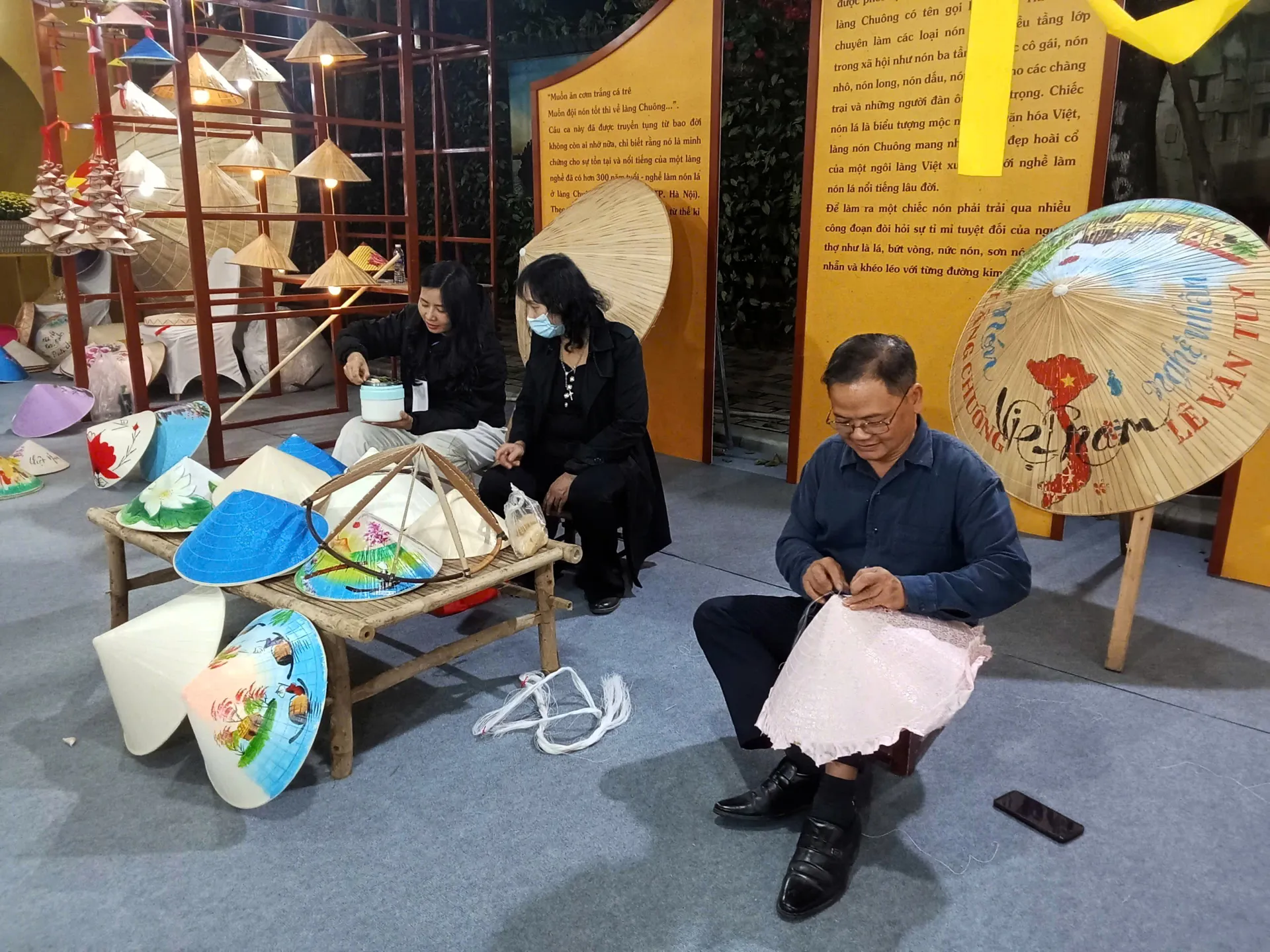Artisans demonstrate the meticulous craft of conical hat making at the festival space dedicated to Chuong Village.