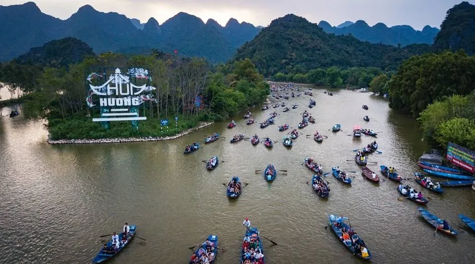 | Photo shows visitors traveling by boat to Huong Pagoda in Hanoi's My Duc District. Photo: The Hanoi Times |