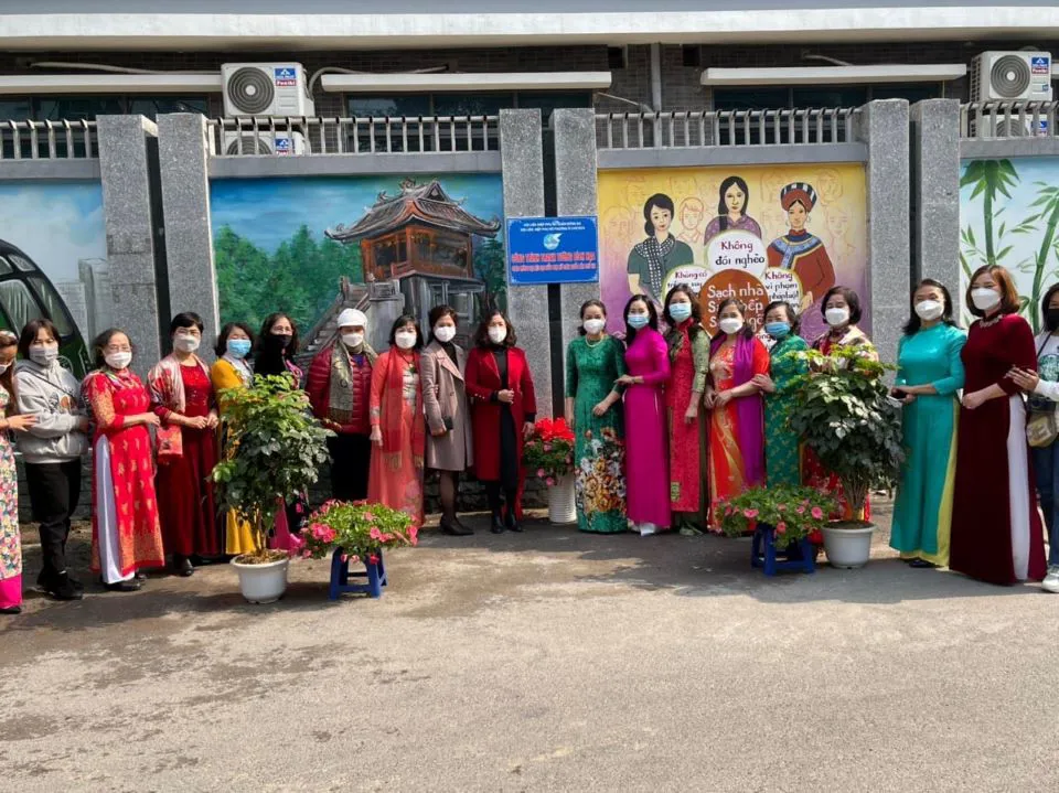 | The women in O Cho Dua Ward, Dong Da District wear Ao dai at the launching ceremony of “Mural Painting Project” undertaken by themselves to beautify the streets. |
