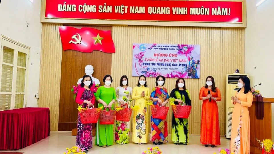 | These women from in Thinh Quang Ward, Dong Da District respond to “Vietnam Ao dai Week” with a green action by encouraging women to bring their own baskets when going shopping and refrain from using plastic bags. |