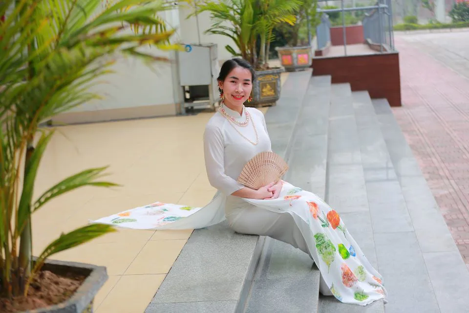 | Dong Anh District Women’s Union organized the contest “Designing and Refurbishing Vietnamese Ao dai 2022 Contest”. A woman wears an Ao dai with decorative patterns created by herself. |
