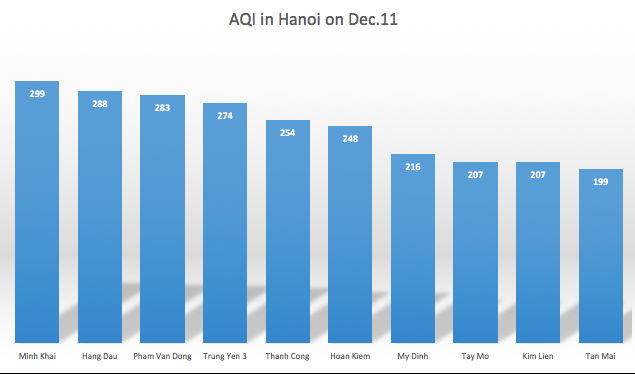 On December 11 afternoon, the AEP said that Hanoi’s air quality index (AQI) measured at 10 monitoring stations in the city was in the range of from 199 to 299.