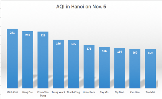 Hanoi’s air quality index (AQI) measured at 10 monitoring stations in the city was mostly at the bad level.