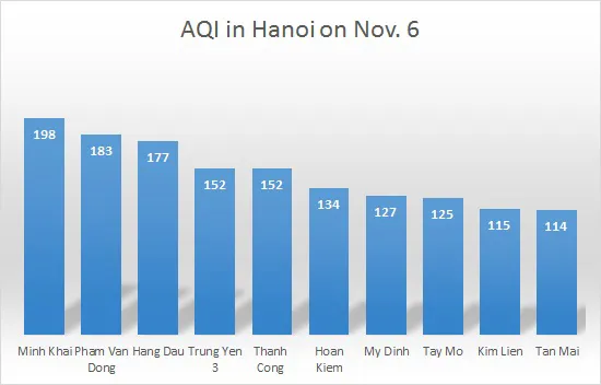 Hanoi’s air quality index (AQI) measured at 10 monitoring stations in the city was mostly at the bad level.