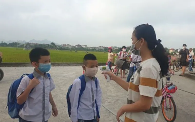 | Pupils wear masks and have their temperatures measured before entering a school. Source: kinhtedothi.vn |