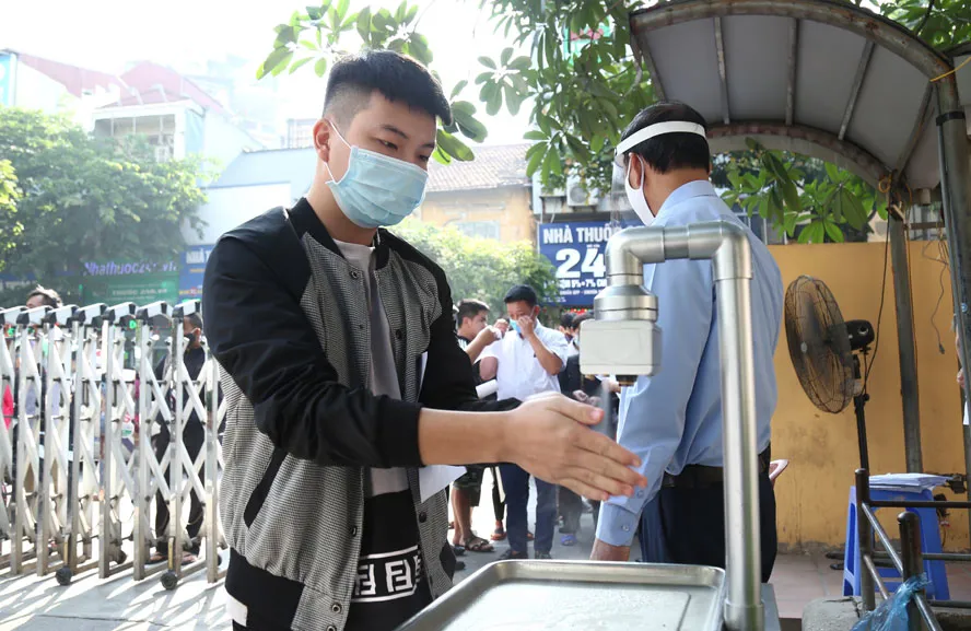 | People disinfect their hands before entering Viet Duc Friendship Hospital. Photo: HNM |