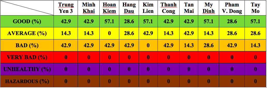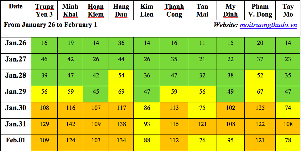 For monitoring stations such as Hang Dau and Thanh Cong, air quality during the week all improved considerably, with good AQI on 2/7 days.