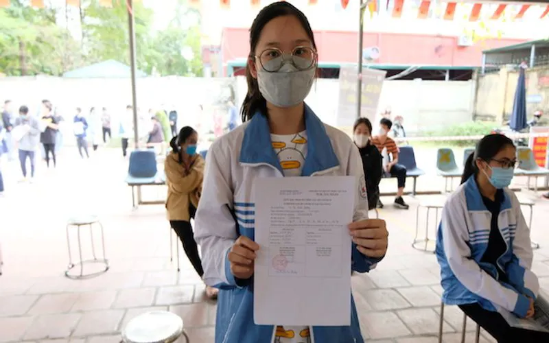 A student of Da Phuc High School in Hanoi's outskirt district of Soc Son completes her vaccination against Covid-19 and receives a certificate in November 2021. Photo: Trong Tung |