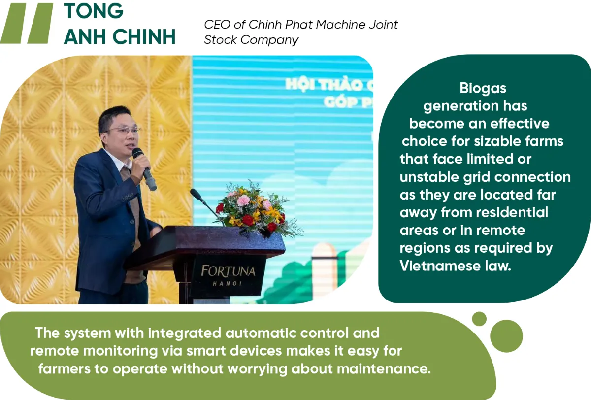 Biogas generation has become an effective choice for sizable farms that face limited or unstable grid connection as they are located far away from residential areas or in remote regions as required by Vietnamese law. The system with integrated automatic control and remote monitoring via smart devices makes it easy for farmers to use without worrying about maintenance, the Hanoi-based business executive shared.