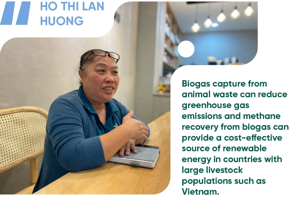 According to Ho Thi Lan Huong, Vice President of Policy and Innovation at the Asia-Pacific Biogas Alliance, and General Secretary of the Vietnam Biogas Association, biogas capture from animal waste can reduce greenhouse gas emissions and methane recovery from biogas can provide a cost-effective source of renewable energy in countries with large livestock populations such as Vietnam.
