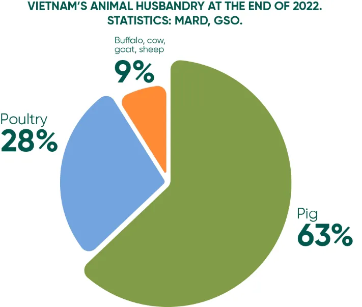 Statistics from the Ministry of Agriculture and Rural Development (MARD) showed that the country’s livestock sector accounted for 28% of agriculture GDP and is one of the fastest-growing agricultural subsectors. However, it’s highly polluting, emitting roughly 15 million tons of carbon dioxide (CO₂) into the atmosphere per year. By the end of 2022, the pig herd reached approximately 28.2 million, accounting for 63% of the country’s livestock and there were around 13,000 medium- and large-sized commercial pig farms (more than 1,000 heads each) in the country. Meanwhile, the country’s total animal waste hit 81 million tons/year.