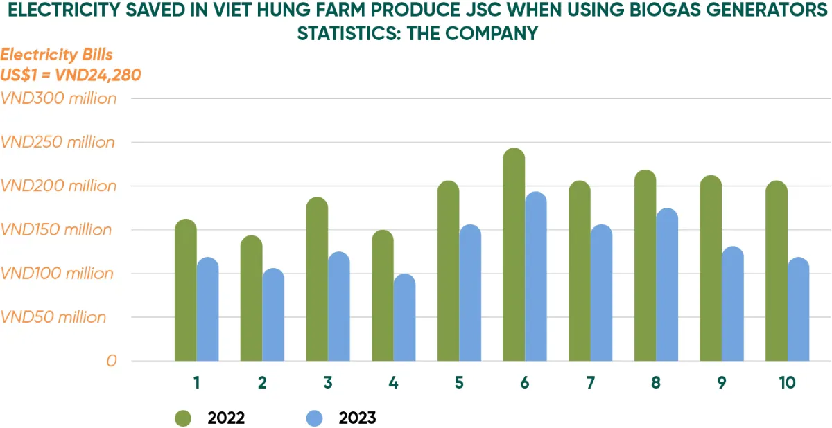 Also benefiting from bioenergy, a 6,000-pig farm of Viet Hung Farm Produce JSC in Van Bao Commune, Thanh Tam Village, Thach Thanh District, the central province of Thanh Hoa saved 30%-50% of monthly electricity costs, averaging VND187 million ($7,714)/month after the installation of biogas generators in September 2022.