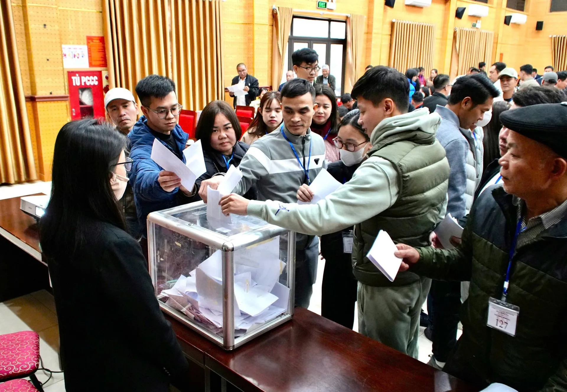 Bidders at the land auction in Tay Phuong Commune on February 8. Photo: Hanoimoi Newspaper